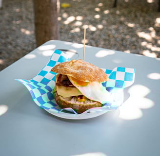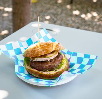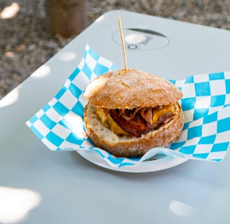 Hamburguesa de vedella 150g, formatge cheddar, ceba confitada, pulled pork i bacó.