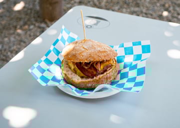 Hamburguesa de vedella 150g, ruca, ceba confitada, formatge de cabra i salsa mostassa-mel.