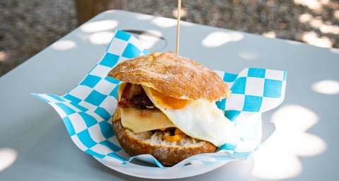 Hamburguesa de vedella 150g, formatge eddam, formatge cheddar, ceba confitada, bacó i ou fregit.